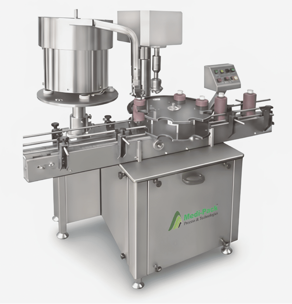 The feed container moving on conveyor belt are fed into star wheel, bringing the container below the sealing head in the subsequent indexing part, mean while the bottle pickup a cap from the delivery chute of cap feeding bowl, where the body and the neck of the container are positioned below the rotating head, where the sealing head is performing perfect operation of threading & sealing.